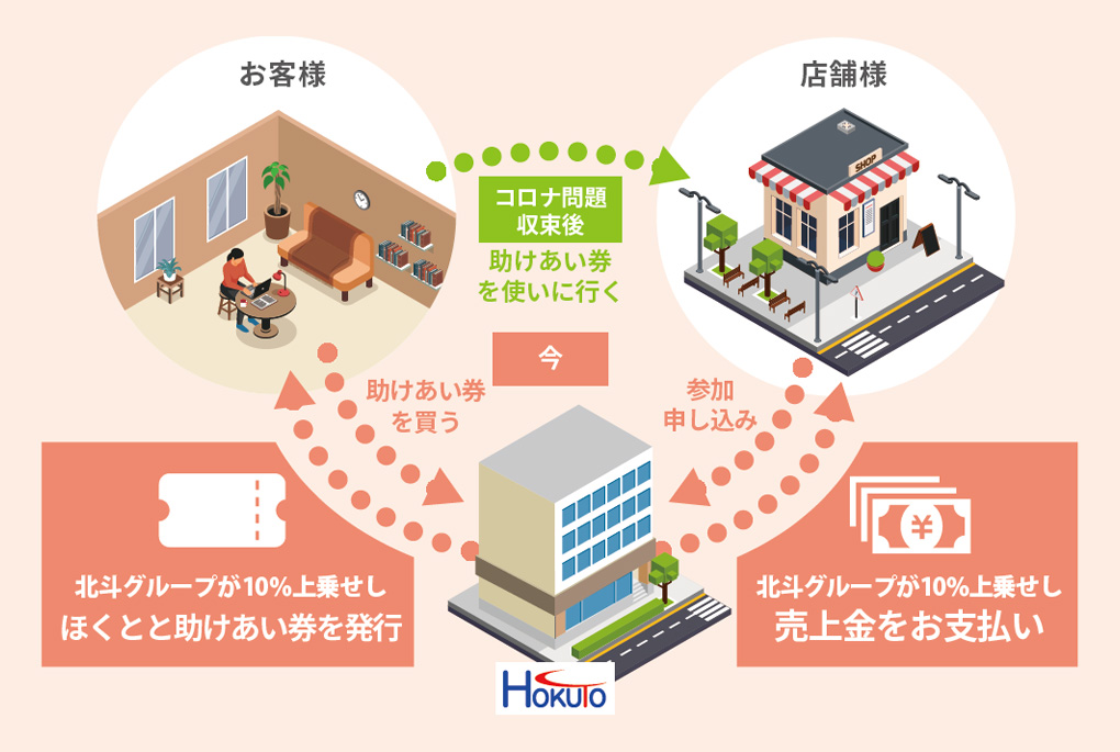 お客様の購入金額に、応援の気持ちを込めて北斗グループより10%補助した券を発行します。10%の支援額を上乗せした券の売上金は対象店舗へ全額お支払いします。